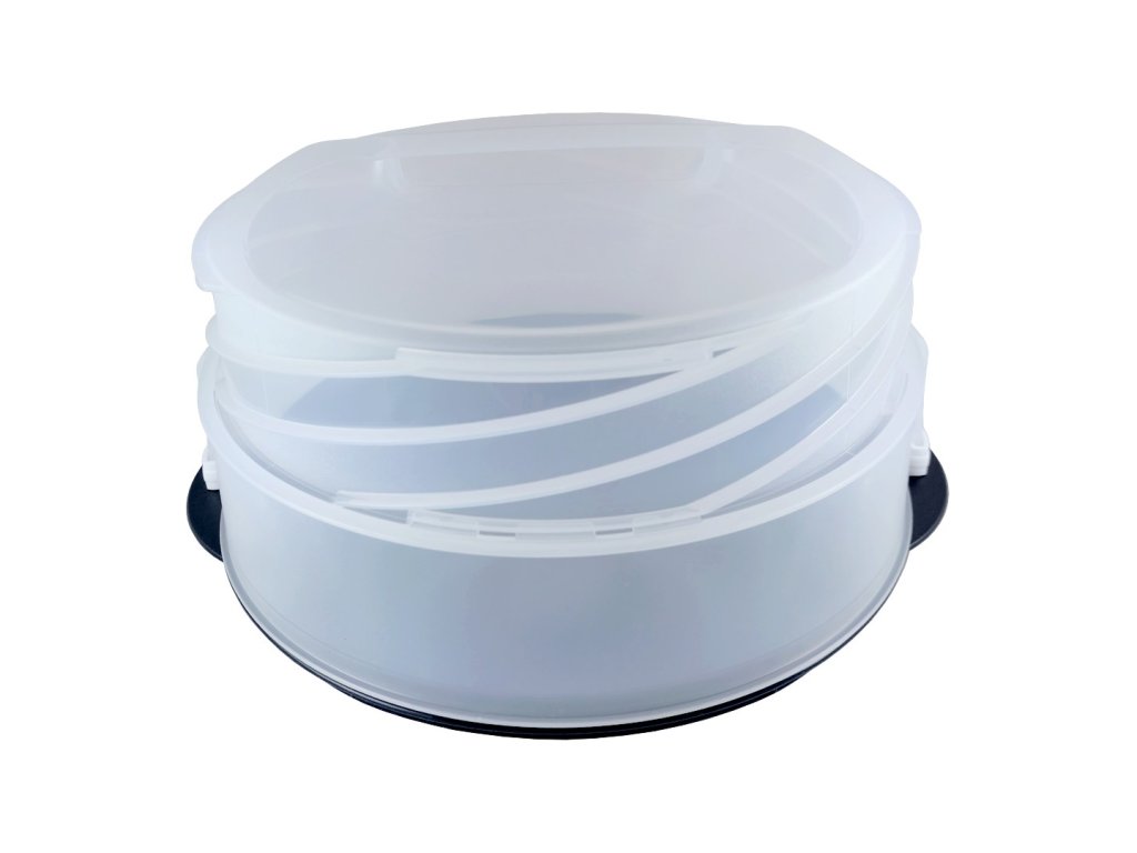 Tento kulatý servírovací podnos s průhledným víkem patří mezi nejoblíbenější výrobky Tupperware. Díky chytrému systému vysouvání můžete zvýšit výšku víka až o 6,5 cm – takže snadno uložíte i vysoký dort nebo vrstvený zákusek.